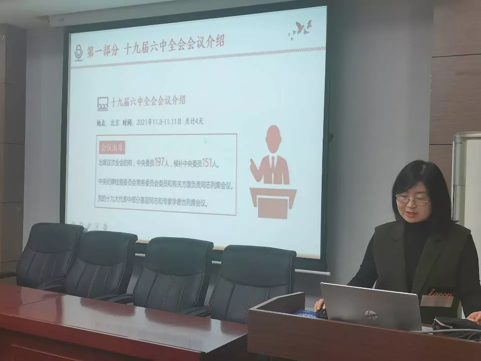 首先,王莉副院长对十九届六中全会中听取和讨论了习近平总书记受中央政治局委托作的工作报告、审议通过的《中共中央关于党的百年奋斗重大成就和历史经验的决议》和《关于召开党的第二十次全国代表大会的决议》两大“决议”进行详细介绍。她讲到这充分体现党深刻把握历史发展规律、始终掌握党和国家事业发展的历史主动和使命担当。