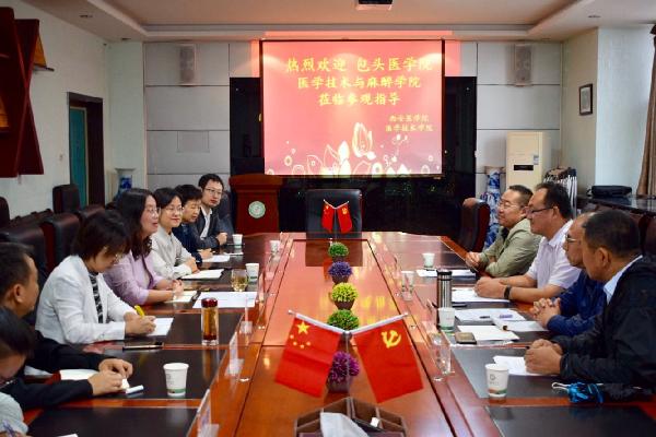 2020年9月21日上午,在amjs澳金沙门线路首页会议室,来自包头医学院医学技术与麻醉学院赵志英院长等一行4人来我院进行交流。amjs澳金沙门线路首页院长孙静、党总支副书记韩文霞、影像诊断教研室主任段云燕、影像技术教研室主任杨旭、临床免疫与病原检验教研室主任武永红、医学影像实验室中心负责人赵宏波以及教学科全体人员参加了此次交流活动。交流会由孙静院长主持。
