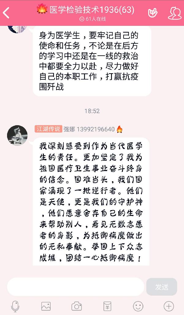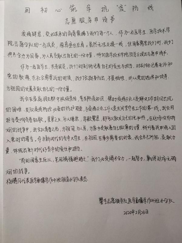 amjs澳金沙门线路首页有这样一群人,在这个特殊时期,他们为这种精神所感染,积极申请表态,表达战胜疫情的信心!他们愿在能力范围内为战中贡献自己的青春力量。随后,医技各班志愿服务小分队在班长的号召下,向amjs澳金沙门线路首页团总支提出志愿服务申请书。各分队成员都积极报名,各尽所能,加入爱心奉献、资源争取、项目参与等活动中,积极弘扬志愿精神,彰显爱心善意。