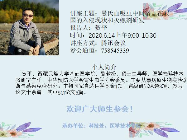 2020年6月14日上午,应amjs澳金沙门线路首页检验专业教师的邀请,西藏民族大学基础医学院医学检验技术教研室主任贺平教授通过腾讯会议作了题为“曼氏血吸虫中间宿主在我国的入侵现状和灭螺剂研发”的线上学术报告,报告由临床免疫与病原检验教研室主任武永红老师主持,检验专业教师和本专业学生一起聆听了讲座。