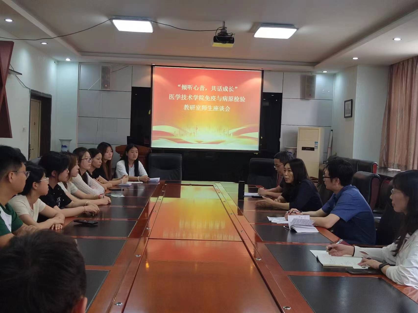 为深入推进学院党建“双创”工作,充分发挥“党建+业务”提升功能,掌握医学检验专业学生思想动态和学业状态,进一步加强学院学风建设,6月4日上午,amjs澳金沙门线路首页教工党支部免疫病原检验教研室开展了以“党建引领,倾听心音,共话成长”为主题的教研活动。学院党总支副书记徐景彩参加活动并讲话。免疫病原检验教研室全体教师、辅导员、学生代表参加了本次活动。会议由教研室主任武永红主持。