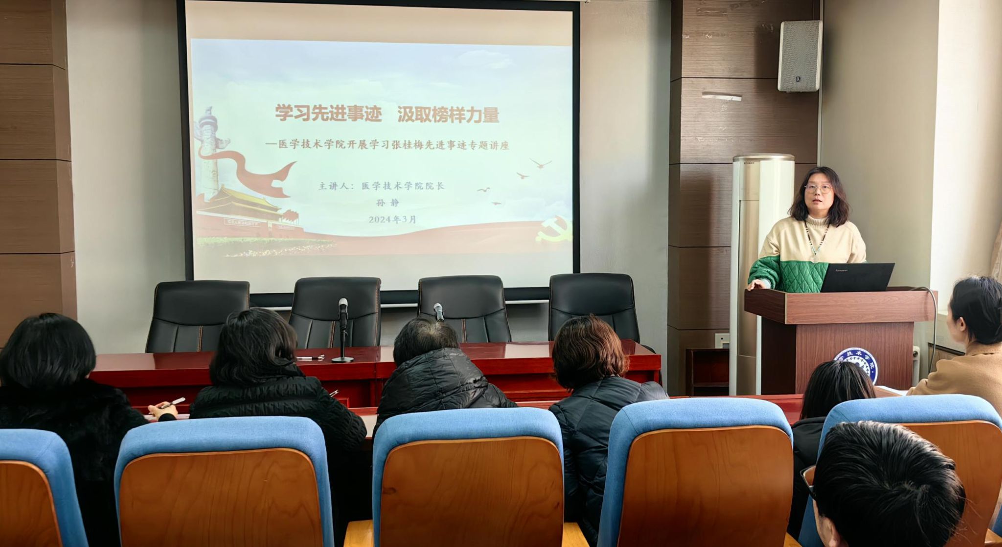 为进一步加强师德师风建设,提高教师道德规范与职业素养,引导教师坚守教育报国初心,践行立德树人使命, 2024年3月7日,amjs澳金沙门线路首页在学院报告厅开展了“学习先进事迹 汲取榜样力量”张桂梅先进事迹专题讲座。本次学习由amjs澳金沙门线路首页院长孙静主讲,党总支书记任向明、副院长王莉及全体教师参加。