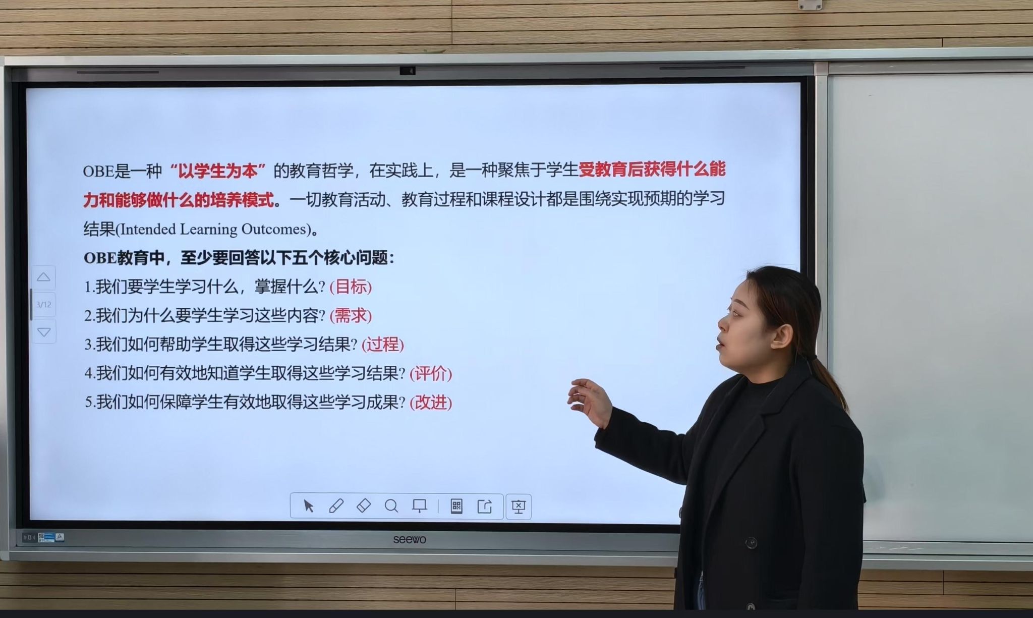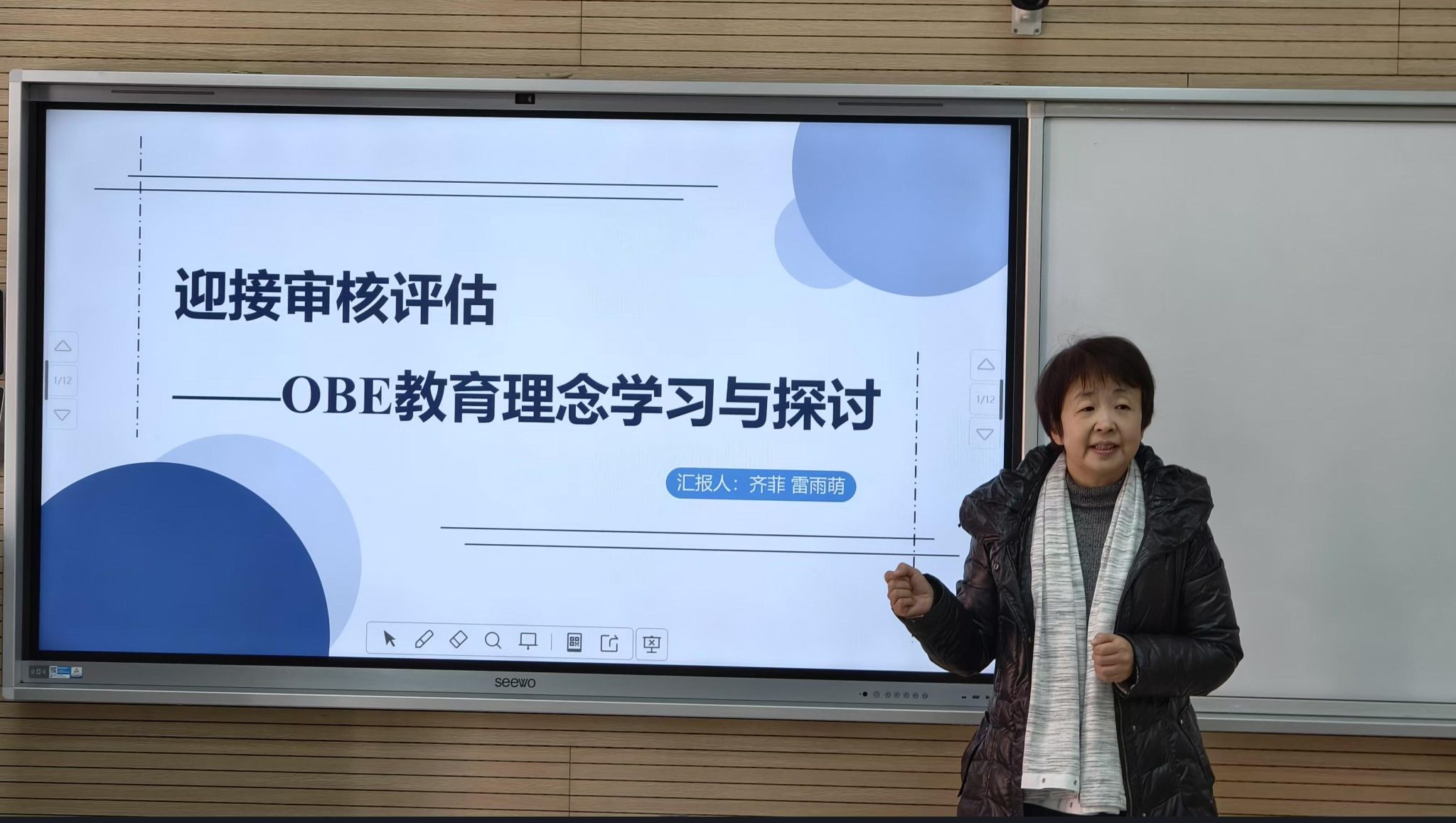 会议开场,气氛热烈。青年教师齐菲率先登台,以深入浅出的方式介绍了OBE理念的原理和概念。OBE理念是一种以学生学习成果为导向的教育模式,重心从传统的教学过程转移到学生最终能达成的学习成果上,这一理念的实施将为教学质量的全面提升提供重要助力。