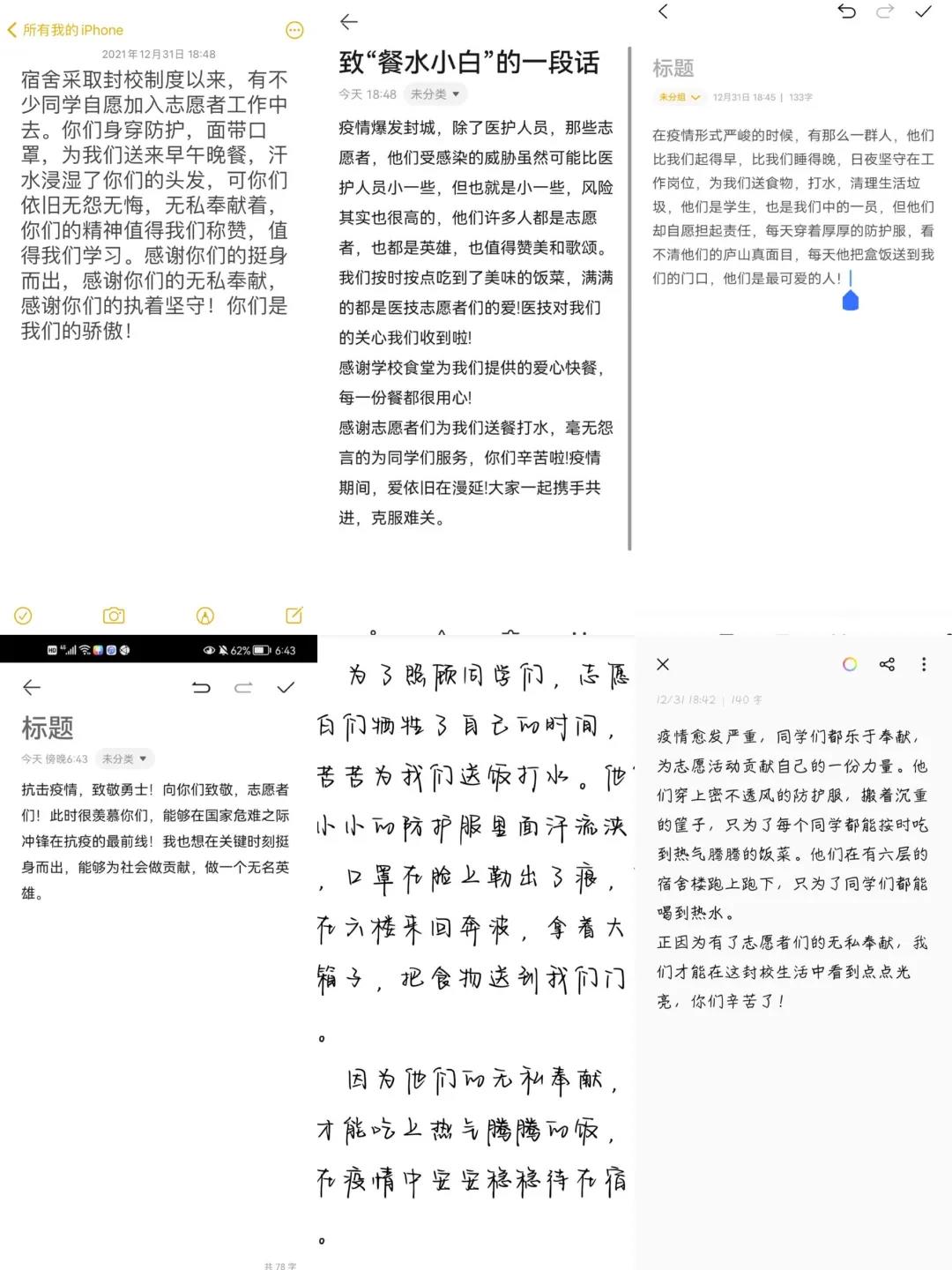 疫情防控少不了志愿者的努力,他们牺牲自己的学习和休息时间为抗疫工作做出贡献,顶着可能出现的不安全因素为大家服务,不求回报。同学们都怀揣着感恩之心,将自己想说的话写下来,向他们表达自己的感谢。哪有什么岁月静好啊,只不过是有人替我们负重前行。