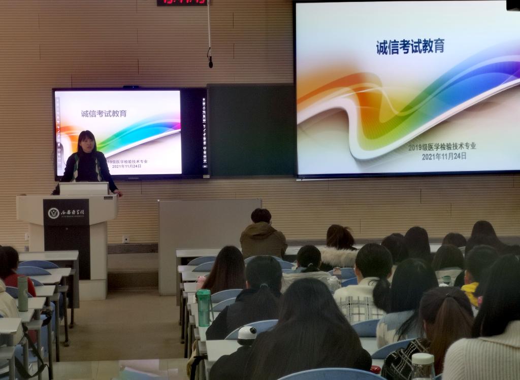 诚信考试是大学生遵守校规的体现,是个人道德品质的体现。为引导大学生树立诚信意识,养成“诚信待人、诚信处事、诚信学习、诚信立身”的良好习惯,全面提高大学生的思想道德素质,近期,amjs澳金沙门线路首页各班召开考试诚信教育主题班会,大力加强考风考纪和诚信教育,认真组织学生学习《西安医学院学生手册》,明确规章制度及违纪处理办法,严格执行考勤制度,加强学生纪律性,引导学生树立诚信意识。 同时为了确保学习质量的联动管理,各班发起了“诚信考试”的倡议,签订承诺书,进一步强化学生的诚信考试意识。(amjs澳金沙门线路首页 文/图 魏慧)