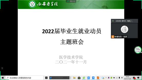 为切实做好2022届毕业生就业工作,使2022届毕业生能够更好的认清就业形势,做好就业准备,把握就业机会,动员准毕业生为招聘会积极准备,2021年11月8日毕业班辅导员张妍、周瑾昱召开了2022届毕业生就业动员主题班会。