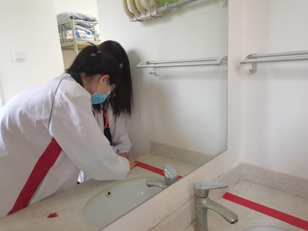 7#437和2#北522作为标间严格按照“5+1”S标准,对书桌、鞋子、洗漱台、水壶、消毒液、水盆、卫生间等多处地方进行规范摆放。在参观过程中,权益部同学为新生详细地介绍物品的正确摆放标准和注意事项,方便新生日常整理的开展。
