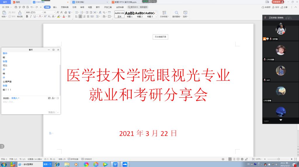 阳春3月,正值毕业生就业黄金时间及考研复试准备阶段,amjs澳金沙门线路首页于322日举办眼视光学专业就业考研分享会,邀请16级毕业生樊磊和张栋栋在线分享,17级和18级眼视光学生参会,会议由就业专干刘向锋主持。