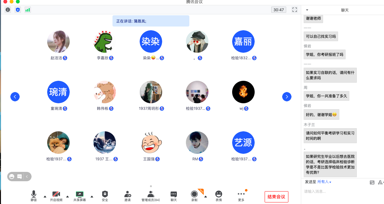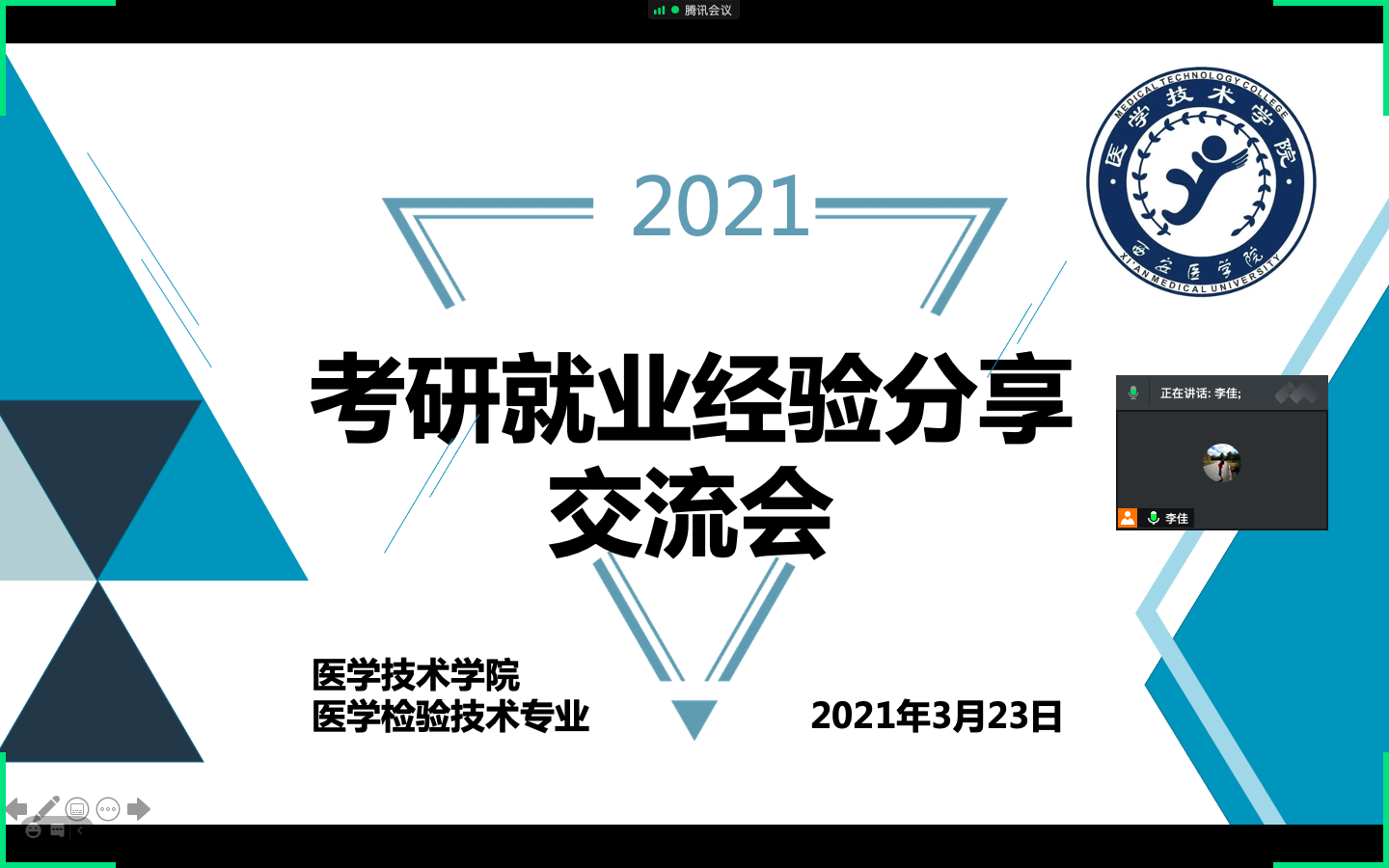 为进一步推动学院学生就业工作,增强我院学生考研、就业的针对性,发挥朋辈榜样作用,3月23日晚,amjs澳金沙门线路首页通过腾讯会议为医学检验技术专业的学子搭建了一个互联互通的交流平台,本次交流会邀请了优秀毕业生蒲晟岚分享成功考验和求职经验。会议由辅导员李佳主持。