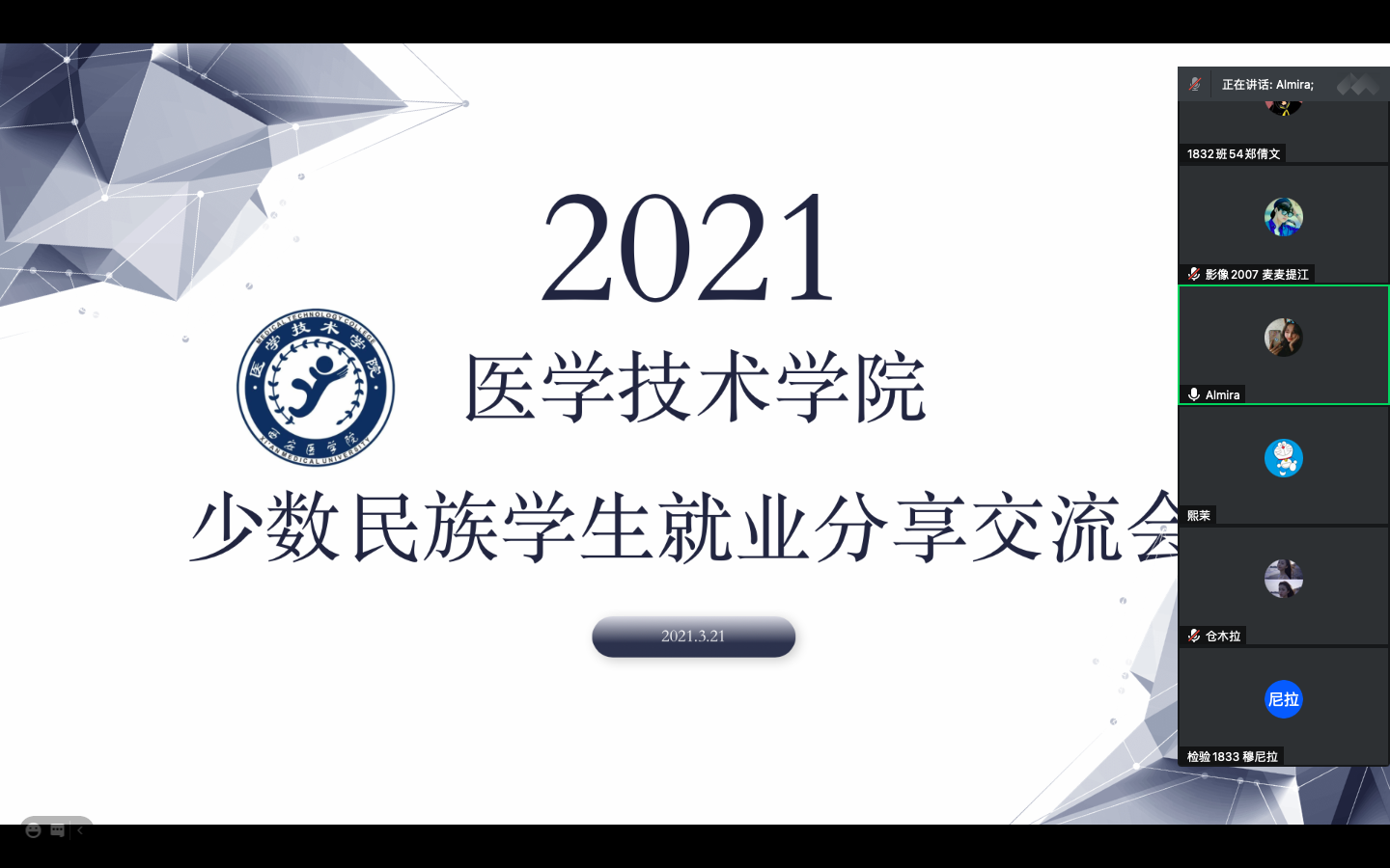 首先,由我院两位少数民族毕业生阿力米热·阿不力孜、仓木拉同学分享自己的就业经验。这两位同学现分别工作于新疆维吾尔自治区阿克陶县人民医院检验科和西藏拉萨市疾控预防控制中心。两位同学通过自身的就业经历、备考事业编考试经历细致化的为同学们传授个人经验。之后,会议进行了答疑环节。同学们根据自己的个人情况,向我院就业老师、两位毕业生进行了提问并得到了回复。