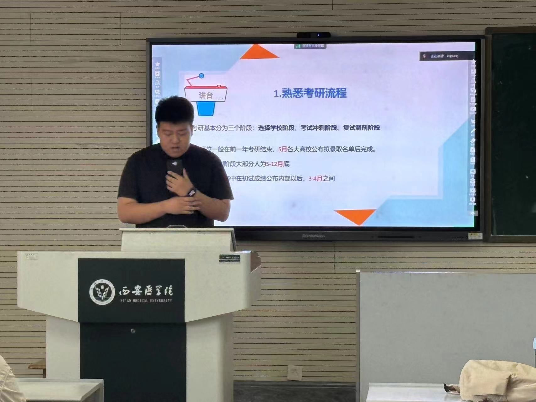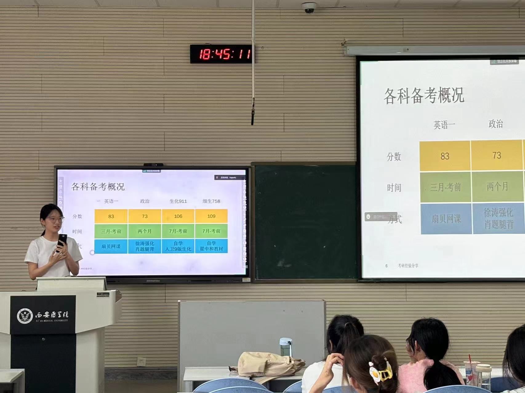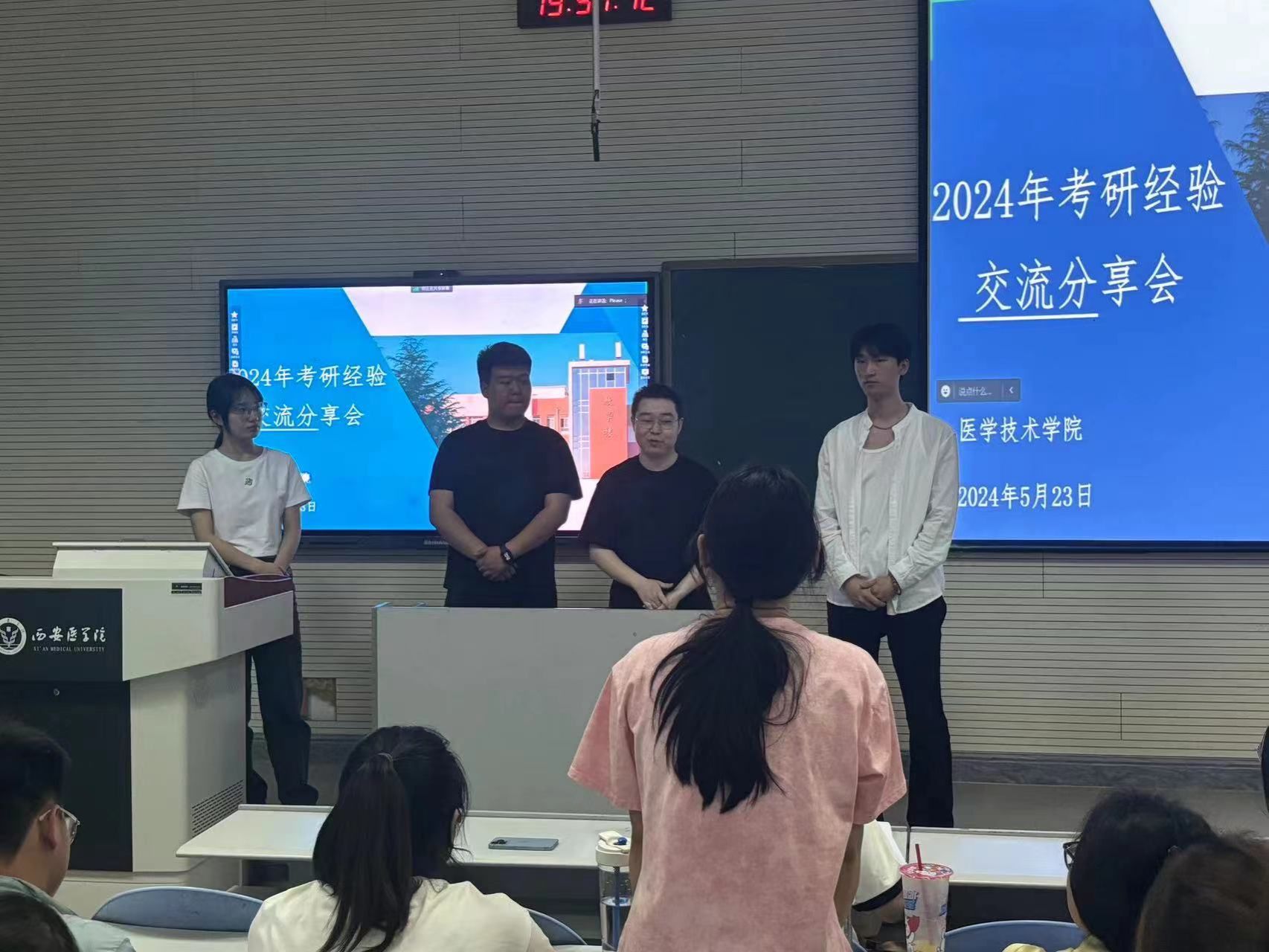 分享会上,学长与学姐结合自身考研经历,从考前准备、学习方法、复试准备等方面分享了自己的经验与技巧。影像1904班沙子卓被复旦大学录取,她与大家分享了自我求学的心路历程,备考科目、资料以及时间规划,引导同学们要有清晰的目标,并鼓励同学们全力以赴的拼搏是人生中最美好的经历和最珍贵的财富。检验2040班赵东阳被西北大学录取,他通过对医学生考研和就业形势的分析,介绍了专业选择的基本原则、职业生涯的规划,并普及了目前各医学学科的需求程度。同时在目标院校、专业方向选择、复试中涉及的专业能力、临场表现、英文面试等方面提出了专业性和实用性建议。