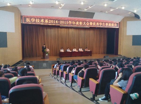表彰大会在庄严的国歌声中拉开了序幕。孙静主任宣读了《医学技术系关于表彰2014—2015学年先进集体及个人的决定》;各级领导为医技金奖、国家奖学金、国家励志奖学金、系优秀学生干部、文明宿舍的受表彰集体及个人代表颁发奖杯和荣誉证书。金旗奖获得者营冰同学、金科奖获得者蔡智豪同学、金杏将获得者李麟娜同学作为代表在大会上进行了优秀学生事迹报告。