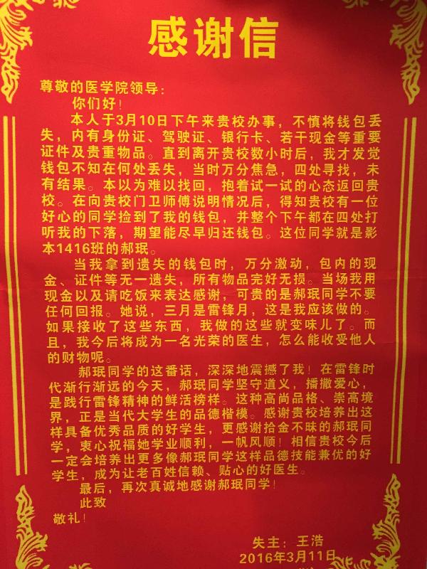 2016年3月10日下午,西安医学院医学技术系临床医学(医学影像学)1416班郝珉同学捡到一个手包,在原地久候失主未到的情况下,她打开手包,发现内有身份证、驾驶证、银行卡、现金及贵重物品。郝珉同学开始四处打听失主的下落,当失主拿到遗失的钱包时万分感激,在确认包内现金、证件、物品无一损坏和遗失后,执意要给郝珉酬金及请吃饭表示感谢,可贵的是郝珉同学不要任何回报,并多次表达自己只是做了应该做的事,将来要成为一名光荣的医生。