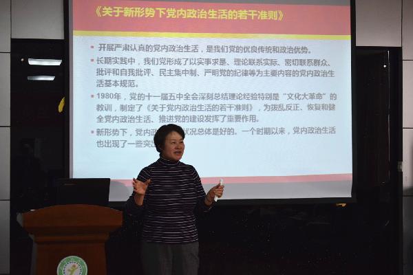 靳红樱副教授报告的题目为《全面从严治党开启新征程——十八届六中全会精神解读》。宣讲紧扣主题、把握重点,从十八届六中全会召开的历史背景、重大意义、会议概况,到全面加强和规范党内政治生活,多方面、全方位地进行了深入的解读,深刻阐述了党的十八届六中全会精神。