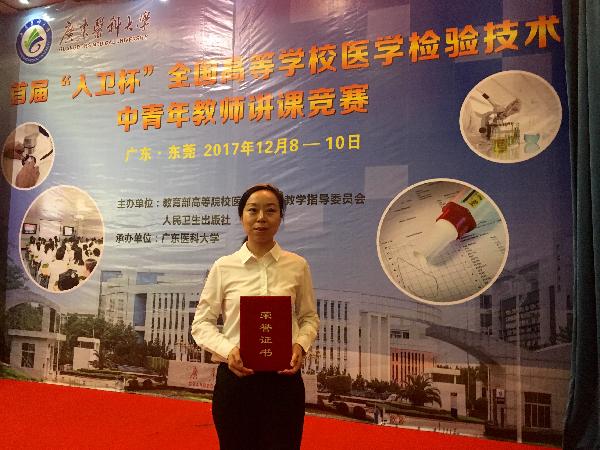 2017年12月8日至11日,首届“人卫杯”全国高等学校医学检验技术中青年教师讲课竞赛在广东医科大学东莞校区举行。本次竞赛由教育部高等学校医学技术类教学指导委员会和人民卫生出版社主办、广东医科大学承办,旨在进一步夯实全国高等学校医学检验技术中青年教师教学基础,推动学术创新,促进教学发展、师资队伍建设和医学检验技术高等教育教学质量的提高。来自全国53所高等医学院校的112名教师进行了为期一天半的激烈角逐。西安医学院医学技术系医学检验技术专业教师邵明明以优异的表现荣获本次竞赛二等奖。
