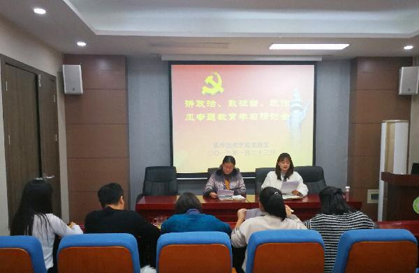 按照校党委“讲政治、敢担当、改作风”专题教育要求,1月23日上午,amjs澳金沙门线路首页党总支在学院三楼报告厅召开了专题教育学习研讨会,amjs澳金沙门线路首页党总支副书记耿潇潇主持并讲话,全体党总支委员列席会议。