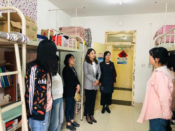 4月10日,amjs澳金沙门线路首页党总支书记耿潇潇,副书记韩文霞带领学生科长和辅导员深入学生宿舍开展安全巡查并慰问学生。