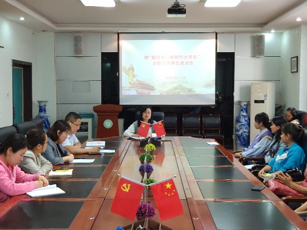 5月14日上午,“知行合一新时代大学生”少数民族学生座谈会在amjs澳金沙门线路首页会议室召开,amjs澳金沙门线路首页党总支副书记韩文霞、学生科长魏慧、各班辅导员及在校少数民族学生参会,会议由少数民族学生管理负责人刘向锋主持。