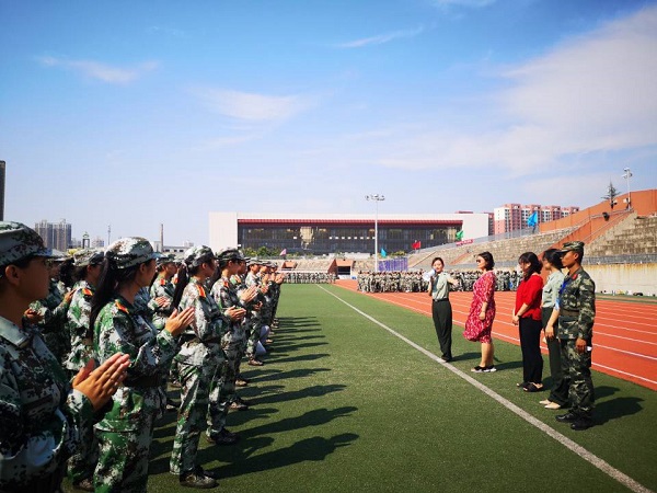 9月3日下午,amjs澳金沙门线路首页党总支书记耿潇潇、院长孙静、副院长王莉、副书记韩文霞、学生科长魏慧、教学科长郭璞走进操场看望军训教官及参训学生。