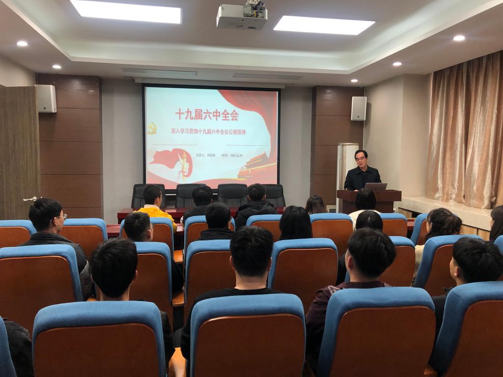 11月29日,amjs澳金沙门线路首页党总支在学院报告厅通过专题党课的形式学习贯彻党的十九届六中全会精神。党总支书记刘养润以“深入学习贯彻党的十九届六中全会精神”为主题讲党课。全体党员教师聆听。
