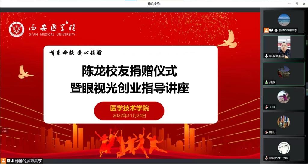 11月24日晚,“陈龙校友捐赠仪式暨眼视光创业指导讲座”在线上召开,院长孙静、副院长王莉、副书记鲁江、就业专干李卓遥、全体眼视光专业辅导员、专任教师及专业学生代表参加了本次会议,会议由眼视光教研室主任杨扬主持。