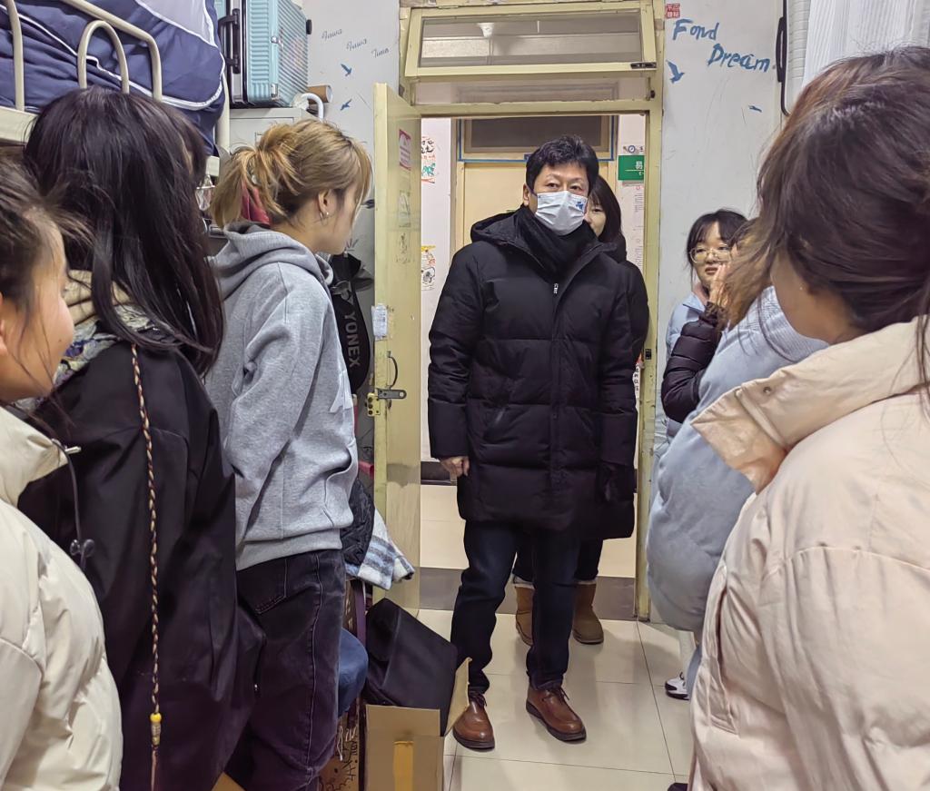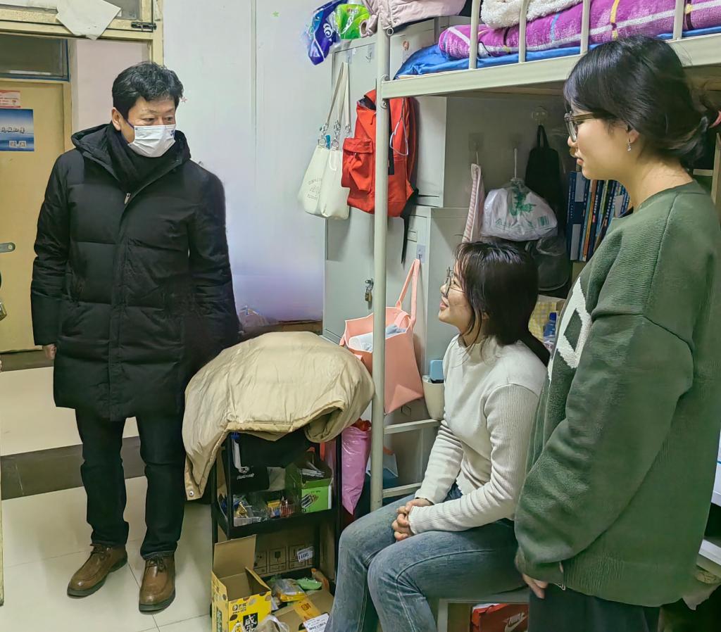走访过程中,任向明书记与同学们进行了亲切的交流,详细了解了学生寝室供暖情况、宿舍安全状况和学生期末复习进度,询问了学生在学习及生活方面遇到的困难并给予针对性地解答。时节入冬,任书记还叮嘱同学们注意宿舍通风,卫生清理,预防感冒、传染病发生,做好日常防护。