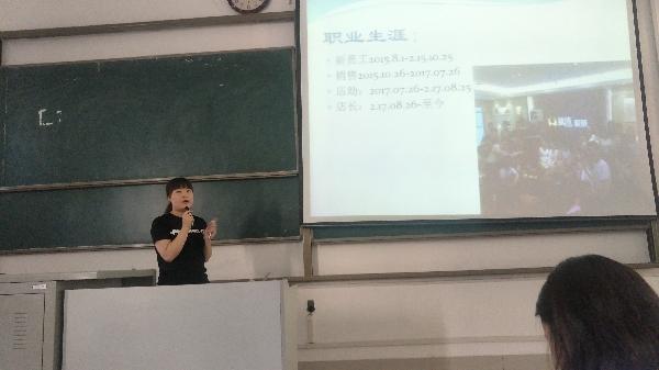 接着,刘杨同学详细而又具体的分享了她从实习到就业,用三年时间从一名新员工到成长为一名可以独当一面的店长的经验。她告诉同学们不管是实习还是就业,一定不能放弃学习,一定要勤快主动学习,只有自己的知识不断积累才能在行业内立足。
