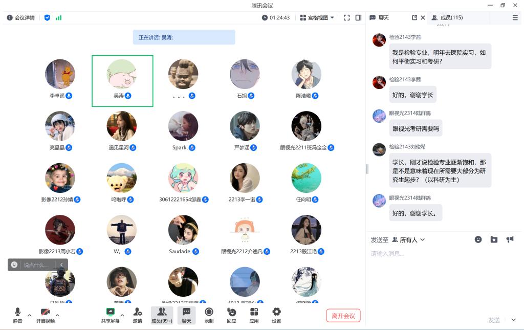 本次分享会包括考研和就业两部分主题。在考研方面,陶泽宇学长先后围绕专业选择、科学择校、初试备考、时间规划等话题向同学们做了详细的介绍,并就专业课、政治、英语科目为同学们提供了具体的复习指导与建议,强调专业课和英语学习的重要性。在就业方面,石旭、陈浩曦、吴涛学长从自身经历出发,分别介绍了事业单位招考、陕西省县级县以下医疗卫生机构定向招聘、公立医院和私立医院的区别,检验专业的就业岗位和现状等,鼓励同学们清晰自我定位,了解自身优势,不同的岗位会有不同的人才需求,最重要的是要提升自己的个人能力和综合素质。同时实习经历也十分重要,充分利用好身边和学校的资源,多关注招聘信息,打破消息壁垒,尽早确立目标并付诸努力,帮助同学们对职业规划有了更清晰的认知。最后在答疑环节,学长们针对同学们提出的疑惑,进行了细致的解答。