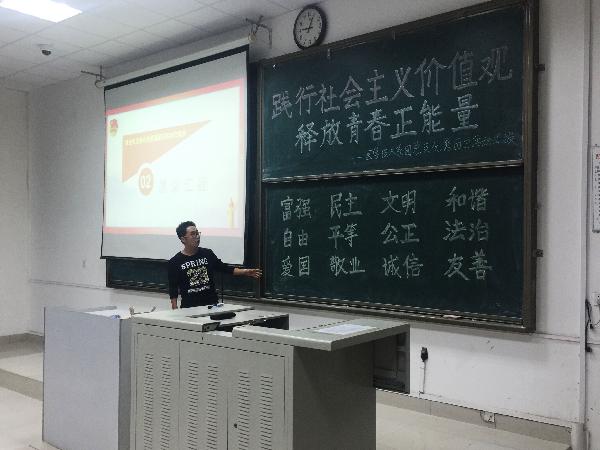 本次团日活动以大力弘扬爱国主义民族精神、推进改革创新时代精神为目的,积极在团员青年中传播推动社会主义核心价值体系,争做践行社会主义核心价值观的先锋。活动形式以观看社会主义核心价值观影片《国魂》及以“社会主义核心价值观”演讲为主,各支部团员青年积极参加,在活动中互相讨论、分享自己对于社会主义核心价值观的理解。各团支部在活动结束后积极总结,分别向团总支进行推优。