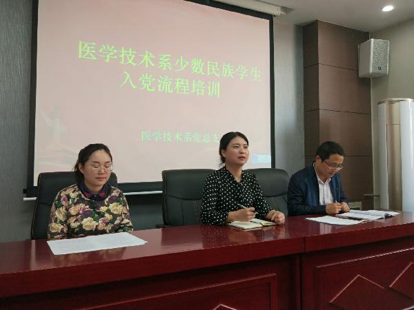 医学技术系是个多民族的大家庭,少数民族同学多才多艺、积极上,很多同学积极向党组织靠拢,递交入党申请书。2018年4月18日,医学技术系党总支在系报告厅举行少数民族学生入党流程培训。本次培训由学生第一党支部书记魏慧主讲,少数民族学生工作负责老师刘向锋主持。系党总支副书记吕宝、辅导员李周、郭璞、杨希、万婧媛,在校少数民族学生37人参加了培训。