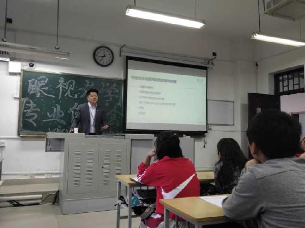爱尔眼科医院徐缓主任作了重要讲解,他分析了近年来中国人口近视发病率的趋势,继而引申出中国视光发展的迫切性和重要性及眼视光发展的广阔前景。苏敏副主任用生动幽默的语言和详细的数据对眼视光学作了进一步的阐述,让同学们对眼视光学未来工作所涉及的领域有了深刻的认知,也使同学们对眼视工作有了一份美好的憧憬。