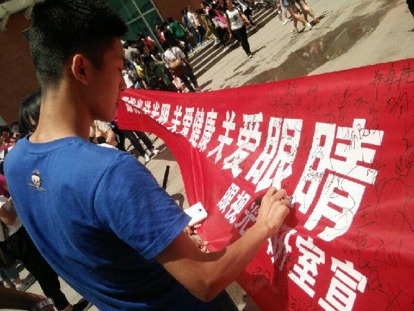 活动包括爱眼护眼知识有奖问答、爱眼倡议签名等环节组成,得到了同学们的积极响应,同学们郑重地在横幅上签上了自己的名字,以表示愿意加入到我们保护眼睛的实际行动中来,活动中眼视光专业的师生还解答了同学们在爱眼护眼中所遇到的困惑,获得了同学们的一致好评。