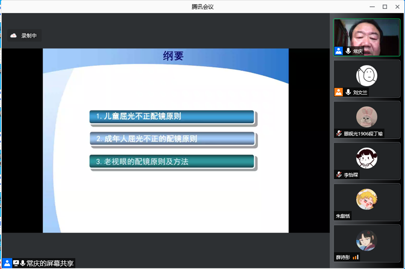常庆精选了眼镜验配领域最新最热的4个专题:小瞳下真实人眼的检影实操、老视验配的新技术及临床应用、特殊患者的配镜原则及病历分析、功能镜片的介绍与验配经验,结合多年临床经验为师生们分享了最前沿的新技术、新工艺、新规范,扩充了学生们课本以外的知识。突发的疫情也没有阻止大家学习的脚步,第3次和第4次专题改为线上分享,常老师和师生们如约在云端相会,疫情虽在,但专业学习“不打烊”,精神食粮永不止。