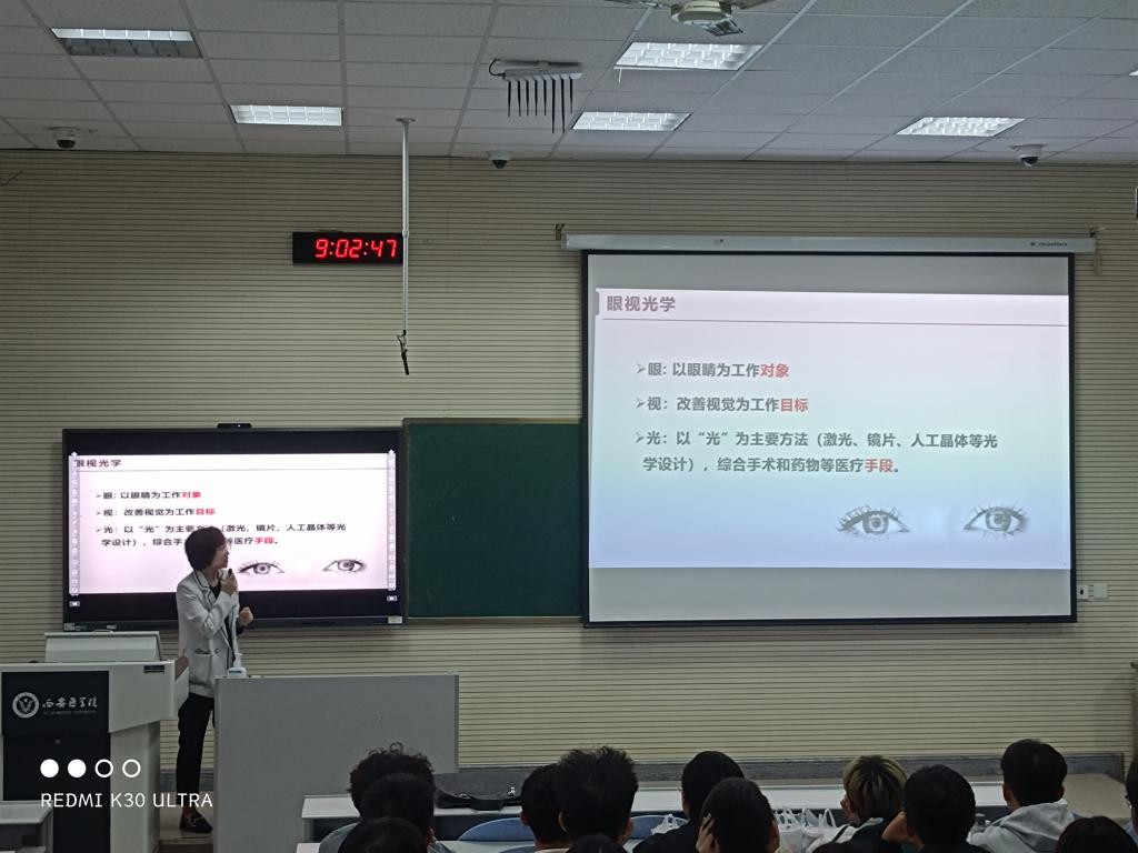 首先,杨扬给学生了介绍国内外眼视光学专业的发展现状、我校眼视光学专业的发展历程、眼视光学专业人才培养方案设置,同时对近年来专业发展特色以及就业情况做了详细的分析,同学们纷纷表示收获颇丰,对眼视光学专业有了进一步的认识。