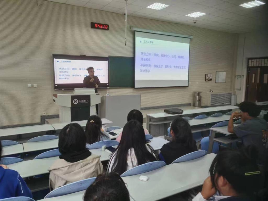 随后,申宇哲根据个人学习工作历程就眼视光学专业的就业以及考研进行了现身说法,解说了研究生可以报考的专业,以及各个专业的研究方向。通过讲解,学生们对眼视光学专业有了更新的认识和理解,也对大学四年该如何安排自己的学习生活有了更加清晰的认知。