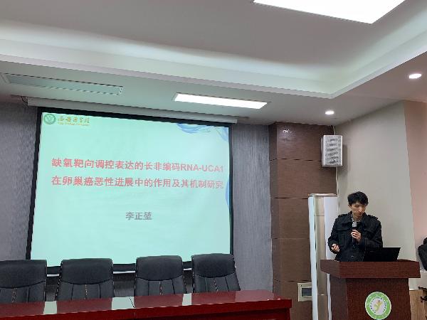 首先,李正堃博士对长非编码RNA在肿瘤发生发展中作用机制的研究成果进行了分享。指出卵巢癌是高致死性的女性生殖系统恶性肿瘤,转移是造成卵巢癌患者死亡的重要原因,但是其内在机制尚未明确。缺氧是实体肿瘤微环境的重要特征,也是诱导肿瘤细胞发生上皮间质转化的重要因素。HIF1α是介导细胞缺氧反应的重要调控因子,在卵巢癌恶性进展中发挥关键作用。同时,指出长非编码RNA在肿瘤发生发展中起着重要作用,项目组前期筛选并克隆出长非编码RNA