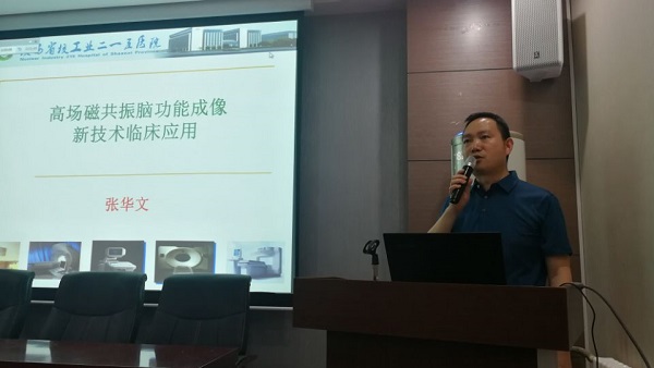 张华文主任从磁共振成像基本原理介绍、高场强磁共振脑功能成像技术简介、磁共振脑功能成像在脑肿瘤的应用、磁共振脑功能成像在脑梗死的应用、磁共振脑功能成像在脑出血的应用等五个方面进行了阐述。报告结束后,教师和学生就相关技术应用细节和疑难点与张主任进行了交流。